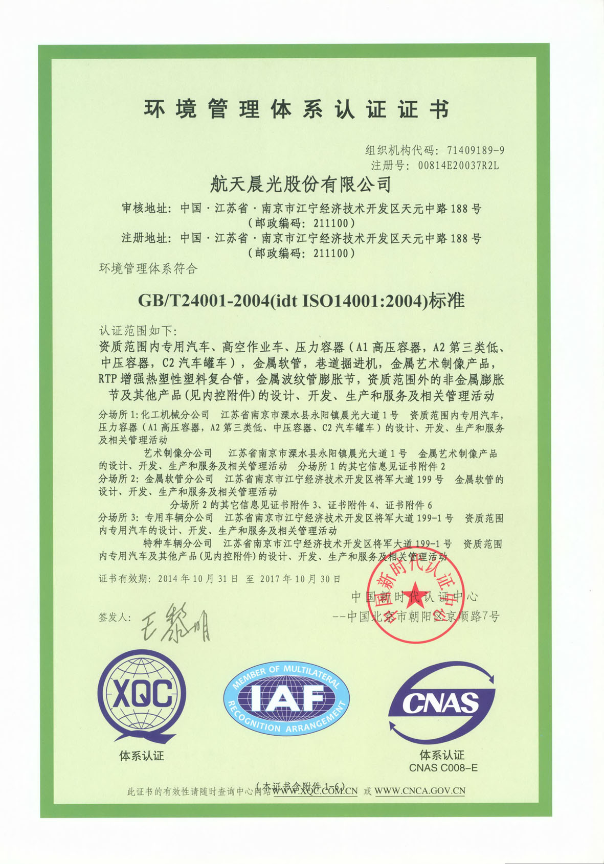 環(huán)境管理體系認證證書
